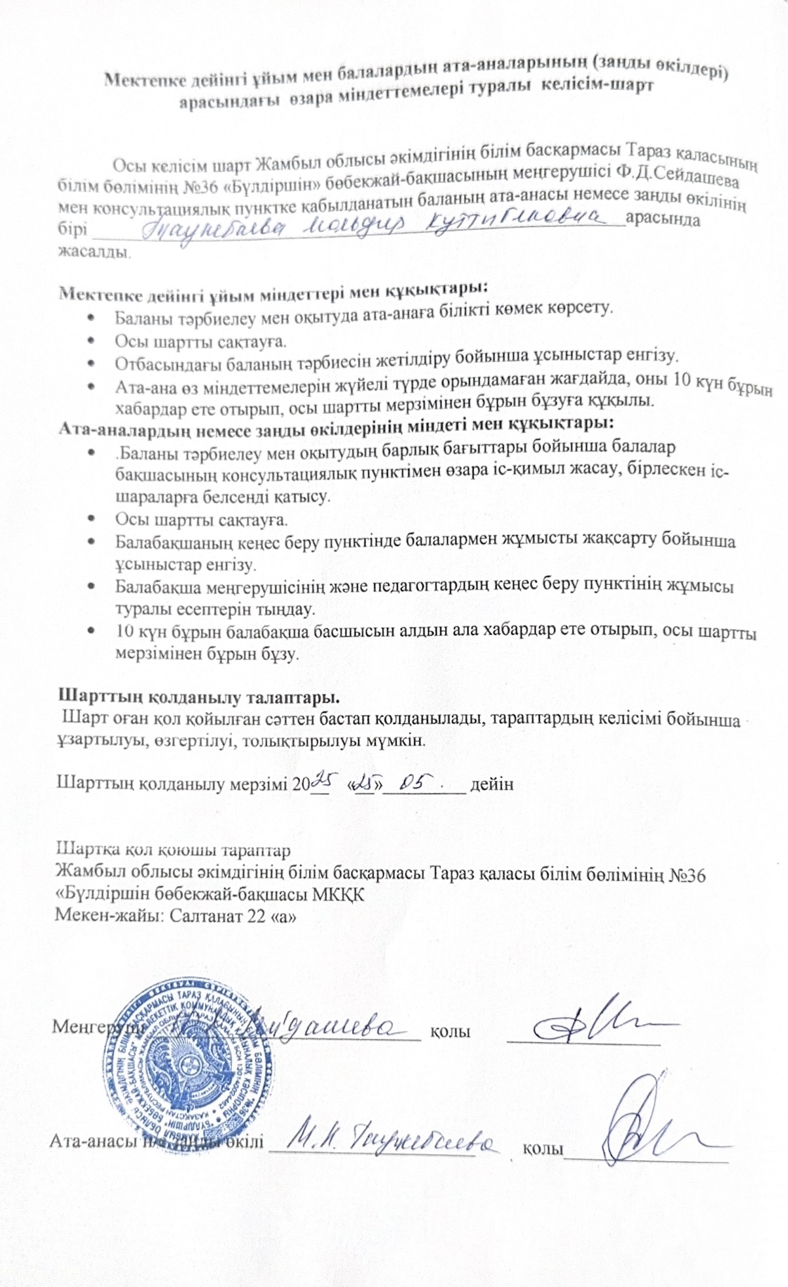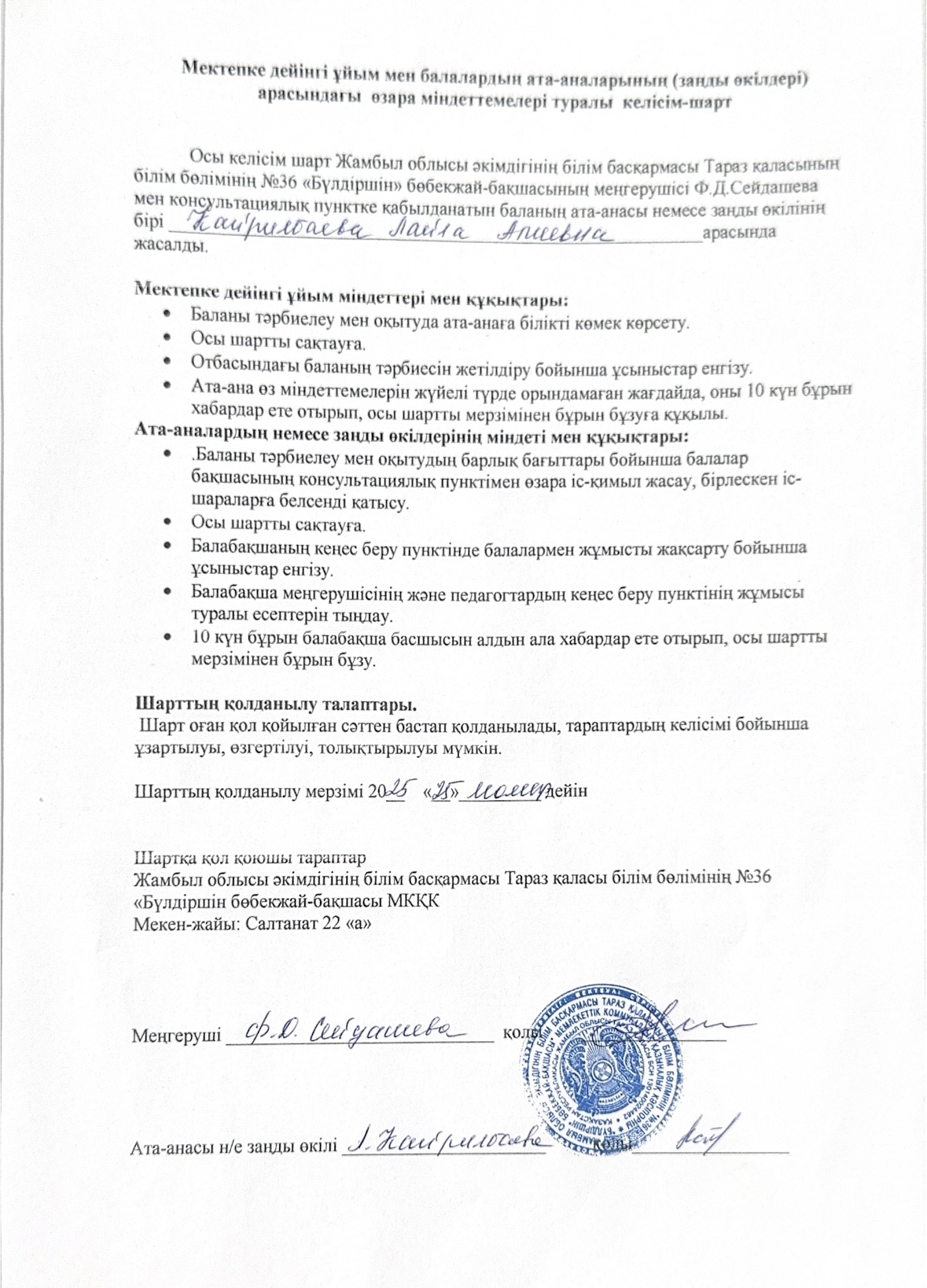 28 август 2024 0 1 2 3 4 5 Мектепке дейінгі ұйым мен балалардың ата-аналарының (заңды өкілдері) арасындағы өзара міндеттемелері туралы келісім-шарт